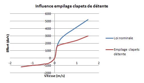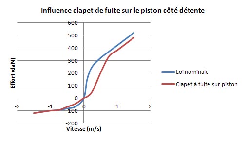 Le montage d’une fuite en détente a beaucoup plus d’influence sur la loi d’amortissement qu’en compression. Elle agît jusqu’à 0.5 m/s. Comme on la vu précédemment, la compression et la détente étant liées, le fait de libérer la détente a tendance à faire aussi perdre un peu d’amortissement en basse vitesse de compression.