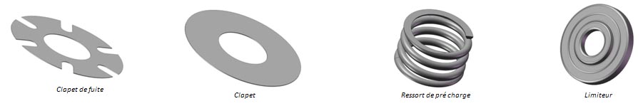 L’hydraulique d’un amortisseur ne se limitant donc pas à un seul point de fonctionnement, il faut pouvoir adapter la loi d’amortissement à toutes les sollicitations. Pour cela nous utilisons des composants flexibles appelés clapets. Ces rondelles en acier à ressort se déforment sous l’action de la pression pour laisser passer le fluide. Ici quatre principaux points conditionnent la loi d’amortissement :